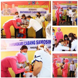 Ketua Bhayangkari Polres Samosir Ny. Widia Hardiman, melaksanakan kegiatan Posyandu di Klinik Polres Samosir Bersama Bhayangkari Cabang Samosir di Halaman Mapolres Samosir, Selasa 14 Februari 2023, Pukul 09.00 Wib.