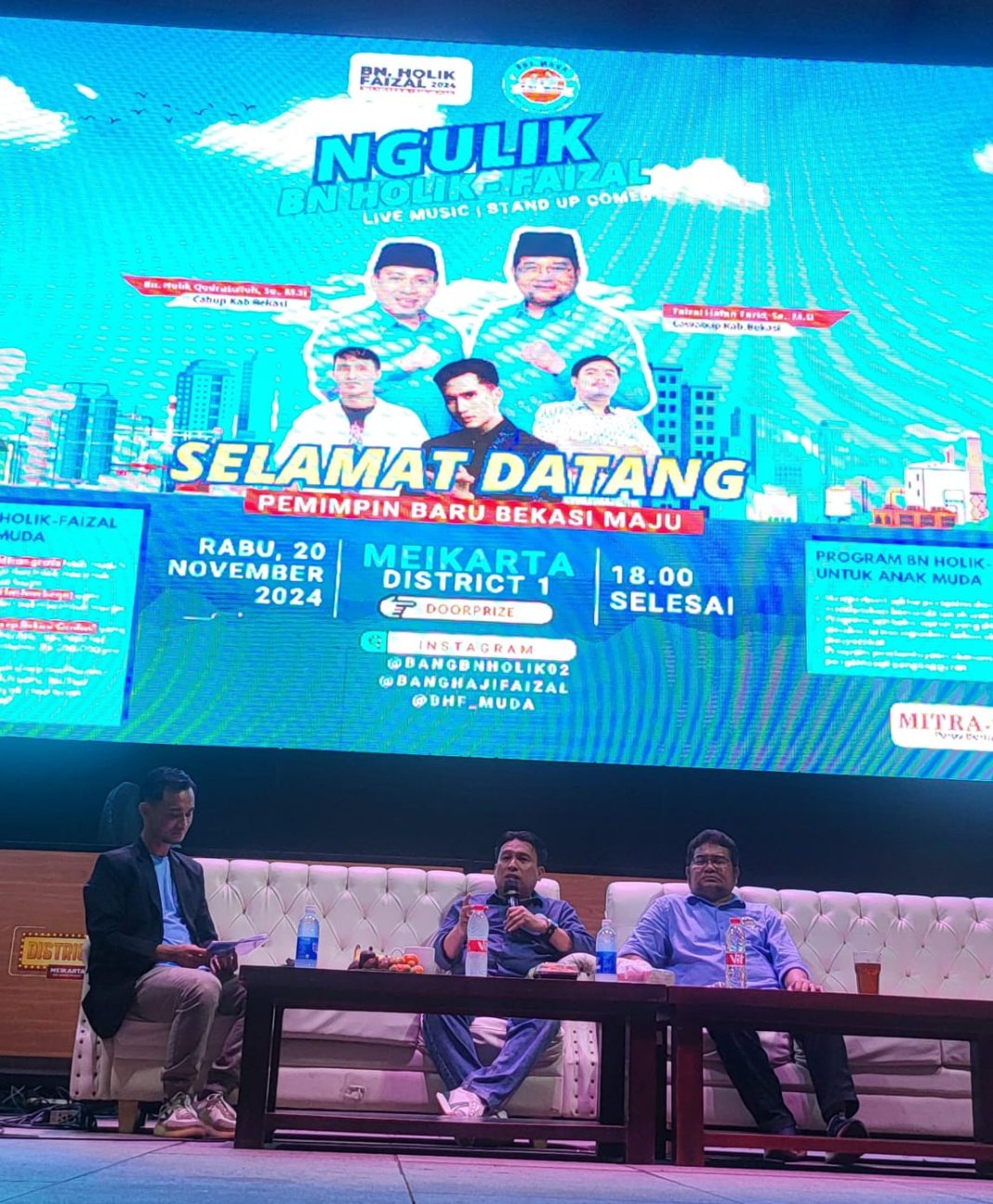 “Topiknya hampir secara umum, tetapi masih dalam kerangka kepemudaan, dan bagaimana komitmen BN Holik dan H. Faizal ketika sudah terpilih menjadi Bupati dan Wakil Bupati Bekasi,” ujarnya.