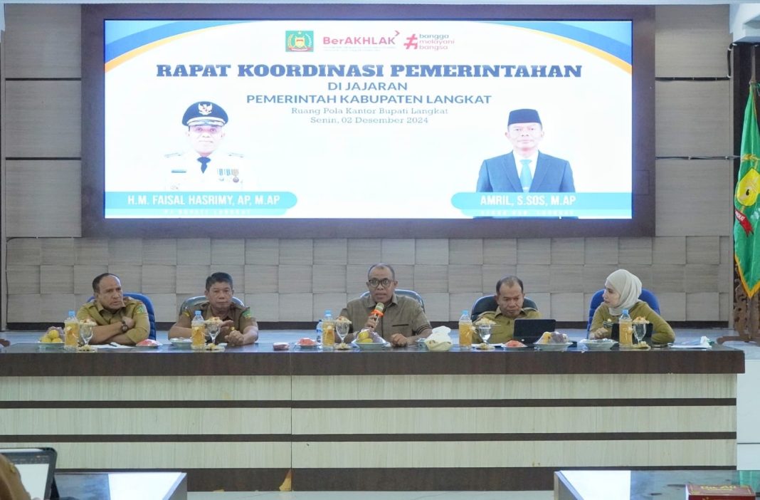 Pj. Bupati Langkat, H.M. Faisal Hasrimy, AP, M.AP, memimpin rapat koordinasi pemerintahan di Ruang Pola Kantor Bupati Langkat, Senin (2/12/2024).