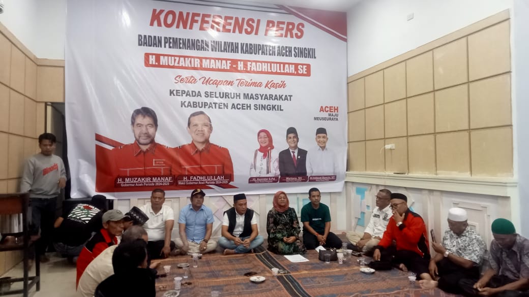 Konferensi Pers dilakukan Pasangan calon Gubernur dan wakil Gubenur Aceh H.Muzakir Manaf – H. Fadhlullah SE menyampaikan Ucapan terima kasih kepada seluruh masyarakat Aceh Singkil dengan kemenangan dalam kontestan Pemilihan Kepala Daerah (Pilkada) Pada tanggal 27 November 2024 kemarin