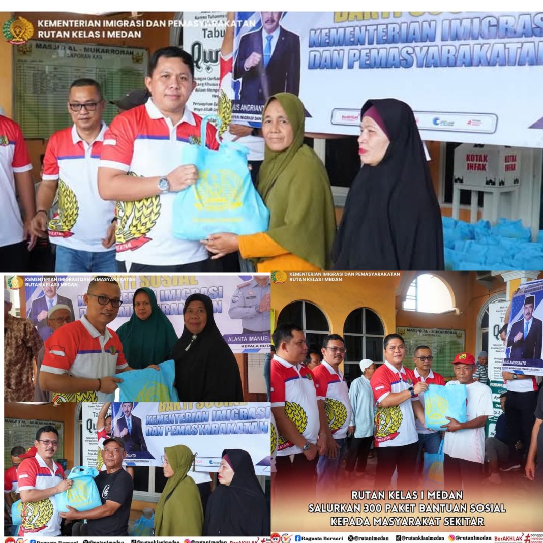 Dalam mendukung serta mengimplementasikan Asta Cita Presiden RI dan Program Akselerasi Menteri Imigrasi dan Pemasyarakatan, Rumah Tahanan Negara (Rutan) Kelas I Medan menyalurkan 300 paket bantuan sosial berupa sembako kepada masyarakat jamaah mesjid di sekitaran Rutan Kelas I Medan. Jumat (17/1/25). Bantuan sosial ini diberikan bertujuan untuk meringankan beban ekonomi masyarakat yang membutuhkan serta guna mempererat hubungan antara Rutan Medan dan lingkungan sekitarnya.