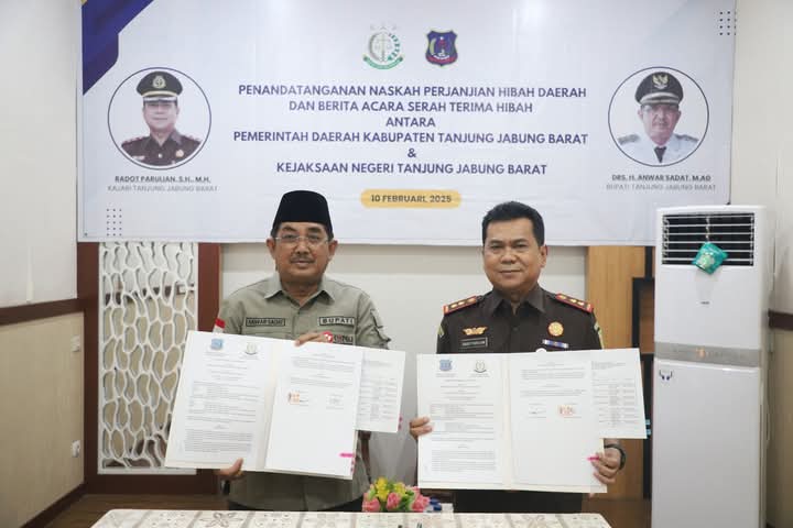 Dalam upaya memperkuat sinergi antara Pemerintah Kabupaten Tanjung Jabung Barat dan Kejaksaan Negeri (Kejari), Bupati Tanjung Jabung Barat, Drs. H. Anwar Sadat, M.Ag secara resmi menyerahkan hibah kantor Kejari yang berada di Desa Pembengis melalui penandatanganan Naskah Perjanjian Hibah Daerah (NPHD) dan Berita Acara Serah Terima Hibah, yang berlangsung di Aula kantor Kejari Tanjung Jabung Barat, Senin (10/02/2025).
