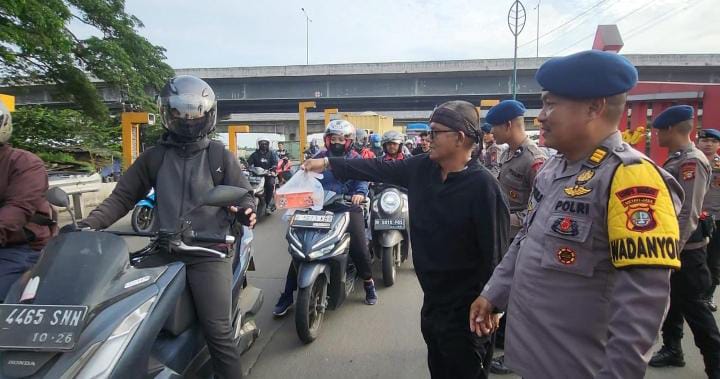 Setibanya di Jembatan Kalimalang Tegaldanas, jajaran Aliansi Ormas Bekasi dan personil Batalyon D Pelopor Satbrimob Polda Metro Jaya langsung membagikan paket makanan takjil kepada para pengendara yang melintas.