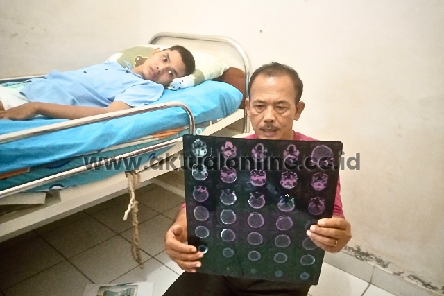 Hotlan Nababan, Kamis (10/4/2025) siang menunjukkan hasil rontgen bagian dalam tubuh anaknya Pratu Reflen Nababan yang ditabrak (kiri). Sementara sang anak berbaring di tempat tidur (kanan) dengan kondisi fisik cacat. (Foto: Prasetiyo/Aktual Online)