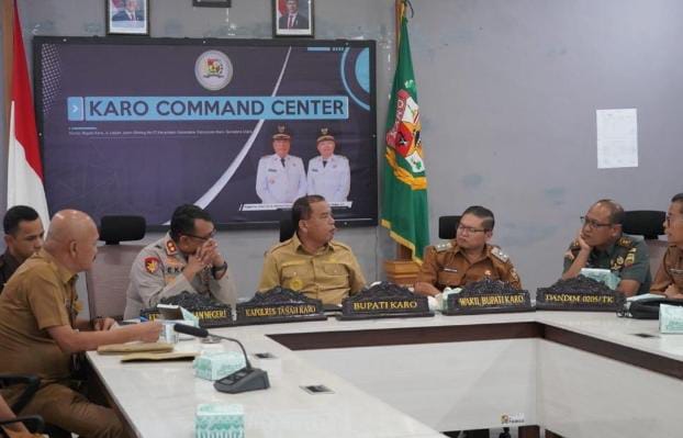 Bupati Karo, Brigjen Pol (Purn) Dr. dr. Antonius Ginting, Sp.OG., M.Kes bersama Forkopimda Kab. Karo ikuti zoom meeting dalam rangka Pengendalian Inflasi Tahun 2025 dan Sosialisasi Sekolah Unggul Garuda di Karo Commend Center (KCC) Dinas Kominfo Karo, Jln. Letjen Jamin Ginting No.17 Kabanjahe, Provinsi Sumatera Utara, Senin (14/04/2025).