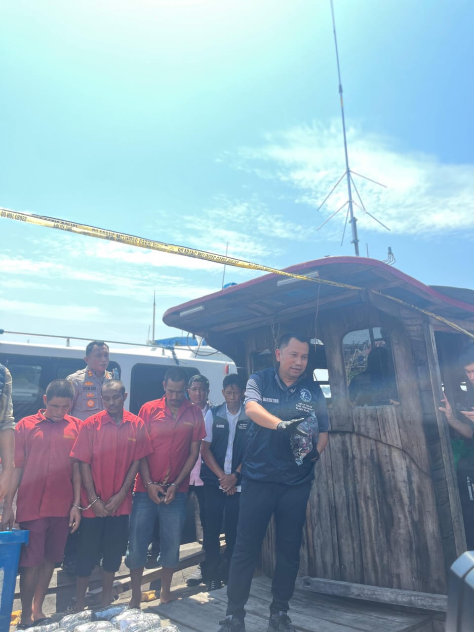 “Setelah itu personel menghentikan laju kapal dan mengamankan tiga orang berinisial AD, IS dan AM. Selanjutnya dilakukan penggeledahan didapat barang bukti sabu seberat 30 kg dan 2.000 liquid vape berisi kandungan obat keras,” terang mantan Kasat Reskrim Polrestabes Medan tersebut.