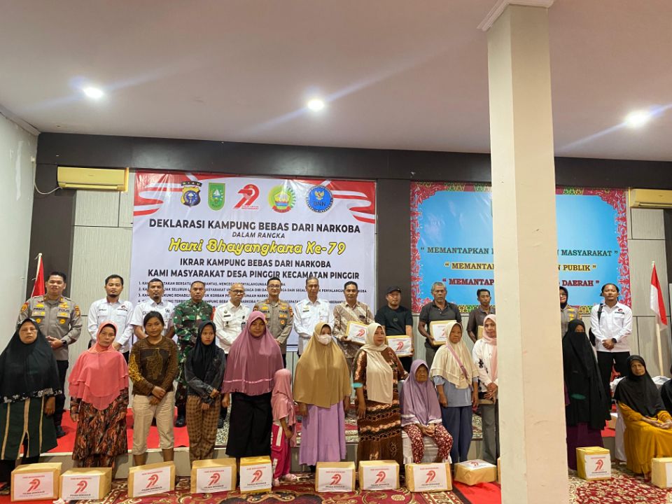 AKTUALONLINE.co.id – BENGKALIS ||| Polres Bengkalis menggelar Deklarasi Kampung Bebas Narkoba Serentak Se Polda Riau dan Pemberian Bantuan Sembako dalam rangka HUT Bhayangkara ke-79 di Aula Kantor Camat Pinggir, Kecamatan Pinggir, Kabupaten Bengkalis pada Rabu (25/6/2025).