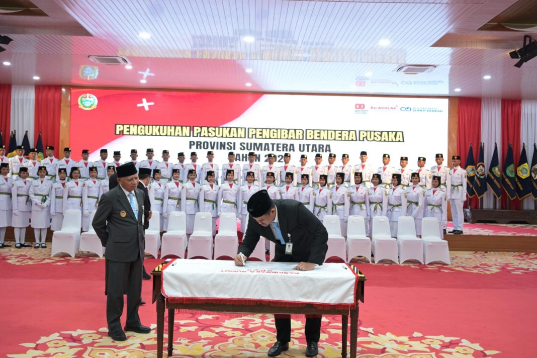 Gubernur Sumatera Utara (Sumut) Bobby Nasution mengukuhkan 173 anggota Pasukan Pengibar Bendera Pusaka (Paskibraka) Sumut, yang akan bertugas mengibarkan bendera pusaka pada 17 Agustus 2025 di Lapangan Astaka. Pengukuhan tersebut berlangsung di Aula Tengku Rizal Nurdin, Jalan Sudirman Medan, Jumat (15/8/2025).