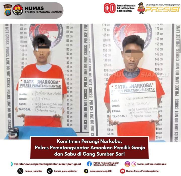 Polres Pematangsiantar buktikan komitmennya dalam pemberantasan narkoba dengan menangkap dua orang laki laki memiliki narkotika jenis ganja dan sabu di Jalan.Singosari Gang Sumbersari Kelurahan Bantan Kecamatan Siantar Barat Kota Pematangsiantar tepatnya dipinggir Parit, pada Rabu 13 Agustus 2025 sore sekira pukul 14.50 WIB.