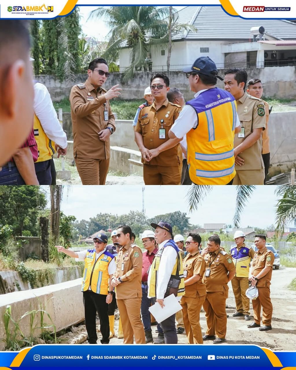 Pelaksanaan Tugas (Plt) Kepala Dinas Sumber Daya Air, Bina Marga, dan Bina Konstruksi (SDABMBK) Kota Medan, Gibson Panjaitan, turut mendampingi Wali Kota Medan, Bapak Rico Tri Putra Bayu Waas, dalam peninjauan progres pembangunan Floodway Sei Sikambing-Belawan yang berlokasi di Jalan Speksi, Lingkungan IV, Kelurahan Asam Kumbang, Kecamatan Medan Selayang, Senin (27/10).