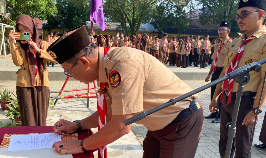 Kepala Sekolah SMPN 10 Medan Sangkot Basuki saat menandatangani berkas dalam pelantikan Majelis Pembimbing, Pengurus serta Pembina Gugus Depan SMPN 10 Medan.