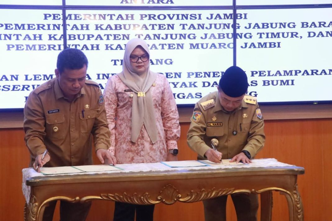 Wakil Bupati Tanjung Jabung Barat, Dr. H. Katamso, S.A., S.E., M.E., menandatangani komitmen bersama antara Pemerintah Provinsi Jambi dengan Pemerintah Kabupaten Tanjung Jabung Barat, Kabupaten Tanjung Jabung Timur, dan Kabupaten Muaro Jambi. Komitmen tersebut berkaitan dengan Penetapan Lembaga Independen Penentu Pelamparan Reservoir Cadangan Minyak dan Gas Bumi di Wilayah Kerja (WK) Migas Jabung dan Migas Lemang, Selasa (04/11/2025).