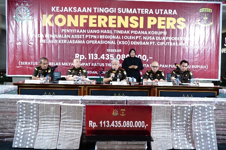 Hal ini dipaparkan Kepala Kejaksaan Tinggi Sumatera Utara Dr Harli Siregar, SH, M.Hum didampingi Aspidsus Mochammad Jefry, SH, MH, Plh Kasi Penkum Indra Ahmadi Hasibuan, SH, MH, Kasidik Arif Kadarman, SH, MH dan Katim Penyidik Viktor, SH, MH pada Konferensi Pers di Hall Kejati Sumut, Senin (24/11/2025).