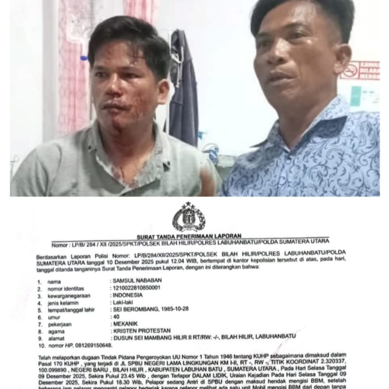 AKTUALONLINE.co.id – LABUHANBATU ||| Korban dugaan penganiayaan, Samsul Nababan, mendesak Polsek Bilah Hilir agar mempercepat penanganan laporan polisi terkait insiden kekerasan yang terjadi di SPBU Negeri Lama, Lingkungan KM I–II, Kecamatan Bilah Hilir, Kabupaten Labuhanbatu, pada Selasa, 9 Desember 2025. Kasus tersebut telah dilaporkan secara resmi melalui laporan polisi bernomor LP/B/284/XII/2025/SPKT/Polsek Bilah Hilir/Polres Labuhanbatu.