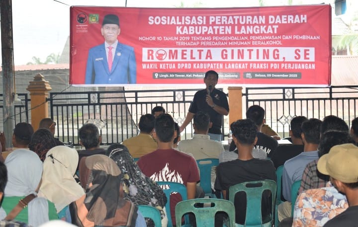 Wakil Ketua DPRD Kabupaten Langkat, Romelta Ginting, melaksanakan sosialisasi Peraturan Daerah (Perda) Nomor 10 Tahun 2019 tentang Pengendalian dan Pengawasan Peredaran Minuman Beralkohol di Lingkungan Air Hitam, Kelurahan Pekan Gebang, Kecamatan Gebang, Selasa (9/12/2025). Kegiatan ini dilaksanakan sesuai jadwal sosialisasi Perda yang telah ditetapkan oleh Badan Musyawarah (Banmus) DPRD Langkat.