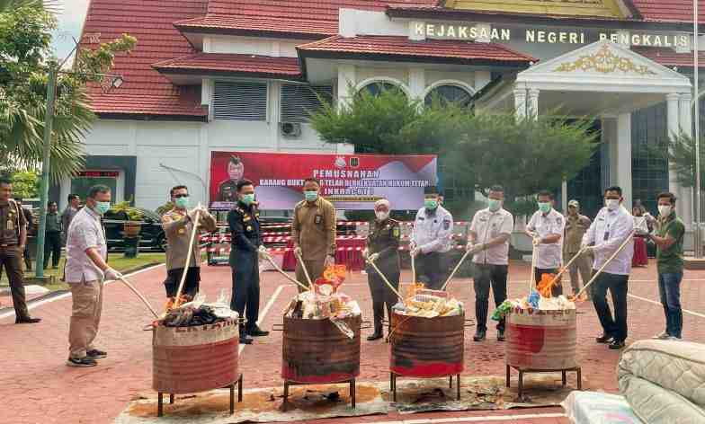 Pemusnahan dilakukan dengan berbagai metode, mulai dari diblender menggunakan bahan kimia, dibakar, hingga dipotong, untuk memastikan seluruh barang bukti tidak dapat disalahgunakan kembali. Dalam kegiatan itu, Kejari Bengkalis memusnahkan barang bukti dari 310 perkara narkotika dengan rincian sabu (2.963 gram), ganja (142 gram), pil ekstasi (781 butir).