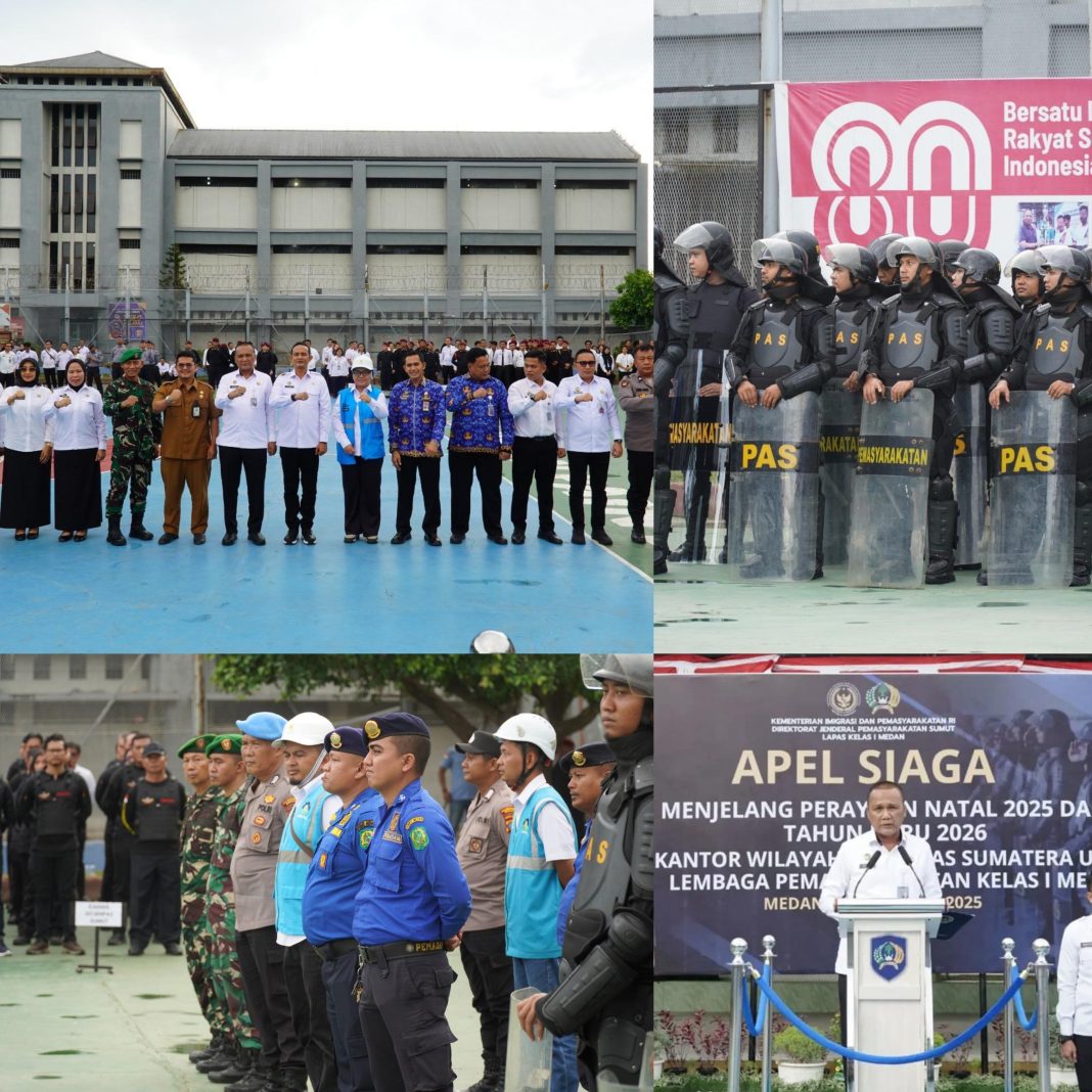 AKTUALONLINE.co.id MEDAN|||Rutan Kelas I Medan turut ambil bagian dalam pelaksanaan Apel Siaga Natal dan Tahun Baru (Nataru) yang digelar oleh Kantor Wilayah Direktorat Jenderal Pemasyarakatan (Ditjenpas) Sumatera Utara sebagai langkah strategis dalam memperkuat pengamanan dan menjaga stabilitas keamanan pemasyarakatan di wilayah Sumatera Utara. Kegiatan tersebut dilaksanakan secara terpusat di Lapas Kelas I Medan. Dipimpin langsung oleh Kepala Kantor Wilayah Ditjenpas Sumut, Yudi Suseno sebagai Pembina Apel dan Kepala Rutan Kelas I Medan, Andi Surya, sebagai Pemimpin Apel. Senin (22/12/2025).