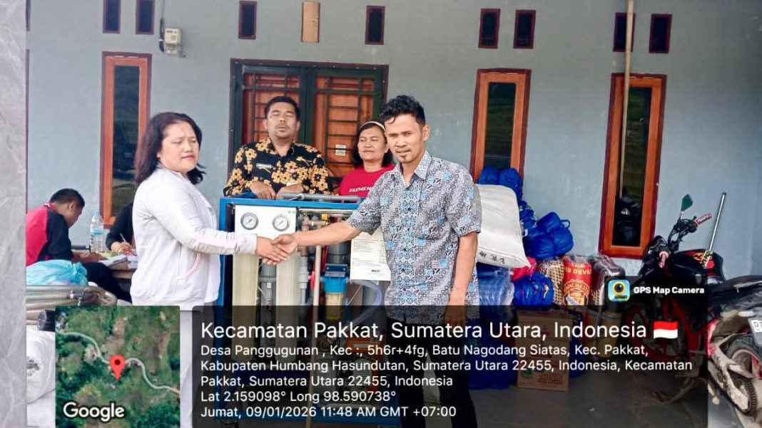 AKTUALONLINE.co.id – HUMBAHAS ||| Pemerintah Kabupaten Humbang Hasundutan melalui Dinas Sosial bersama Dinas Koperasi dan Tenaga Kerja (Kopenaker) menyerahkan bantuan berupa alat penyuling air kepada masyarakat Desa Panggugunan Kecamatan Pakkat, Jumat (9/1/2026). Bantuan tersebut merupakan dukungan dari Kementerian Koperasi bagi masyarakat yang terdampak bencana.