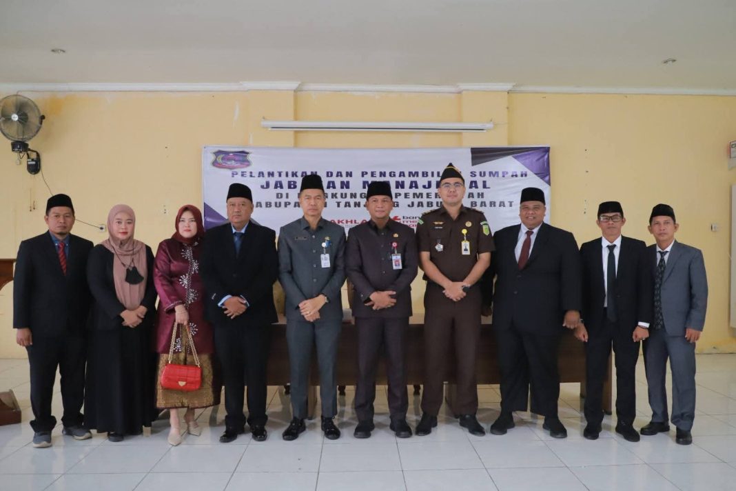 Mewakili Bupati Tanjung Jabung Barat, Sekretaris Daerah (Sekda) Kabupaten Tanjung Jabung Barat, Hermansyah, S.STP., M.H., melantik dan mengambil sumpah jabatan 7 (tujuh) pejabat administrator (Eselon III) dan pejabat pengawas (Eselon IV) di lingkungan Pemerintah Kabupaten Tanjung Jabung Barat.