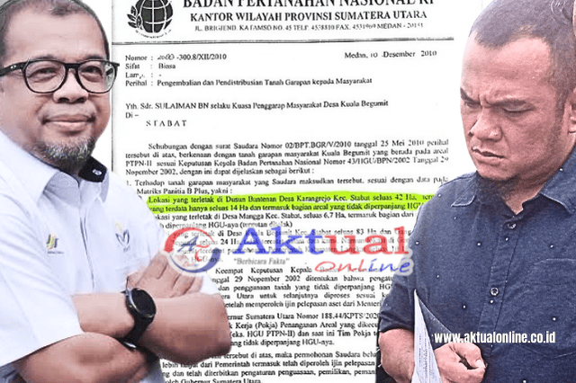 SEVP PTPN Regional I Ganda Wiatmaja dan Anggotanya M. Chairul Ichlas dengan latar belakang surat keterangan BPN Sumut bahwa 14 Ha lahan di Karang Rejo Langkat bukan HGU namun diklaim HGU. (Foto: Ist/Aktual Online)