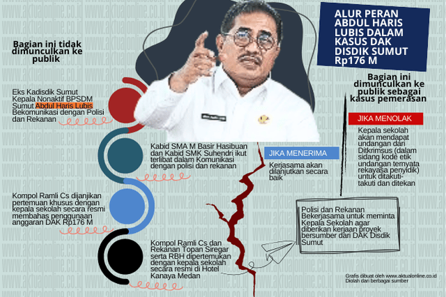 Alur peran eks Kadisdik Sumut Abdul Haris Lubis dalam kasus DAK Rp176 miliar. (Grafis: Tim Aktual Online)
