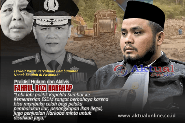 Praktisi Hukum dan Aktivis Fahrul Rozi Harahap dengan latar belakang korban percobaan pembunuhan nenek Saudah dan Kapolda Sumbar Irjen Pol Gatot Tri Suryanta. (Grafis: Tim Aktual Online)