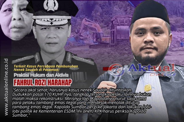 “Secara akal sehat, harusnya kasus nenek Saudah dituntaskan. Dudukkan pasal 170 KUHP nya, tangkap tersangka pelaku lainnya bukan malah maksa rekonstruksi. Mirisnya lagi, Kapoldanya nurut saja sama para pelaku tambang emas ilegal yang mendesak menolak ditutup tambang emas ilegal. Kapolda Sumbar pergi ke Jakarta dan lakukan lobi-lobi politik ke Kementerian ESDM. Ini aneh, KPK harus periksa Kapolda Sumbar,” desak Fahrul Rozi Harahap.