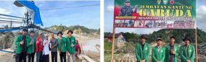 Mahasiswa bersama relawan TNI Angkatan Darat membantu pengamanan warga yang ingin menyeberangan jalan menggunakan jembatan gantung maupun perahu getek milik warga dan Pemda setempat.