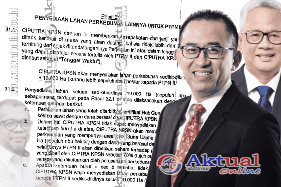 Direktur Utama PT. Ciputra KSPN Harun Hajadi (depan), eks Dirut PTPN II (red.sekarang PTPN I Regional I) dan potongan perjanjian yang dilanggar PT. Ciputra KSPN. (Foto: Ist-Prasetiyo/Aktual Online)