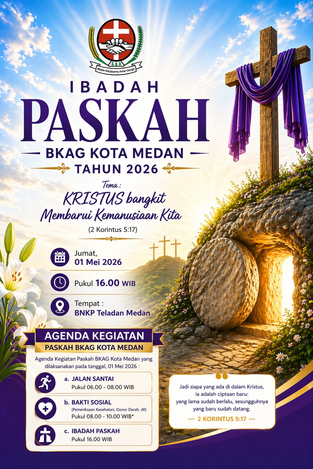 AKTUALONLINE.co.id – MEDAN ||| Badan Kerja Sama Antar Gereja (BKAG) Kota Medan akan menggelar rangkaian Ibadah Paskah Tahun 2026 dengan mengusung tema “Kristus Bangkit, Membarui Kemanusiaan Kita” yang diambil dari 2 Korintus 5:17. Kegiatan ini menjadi momentum penting bagi umat Kristiani untuk merayakan kebangkitan Yesus Kristus sekaligus memperbarui kehidupan dalam iman dan kasih.