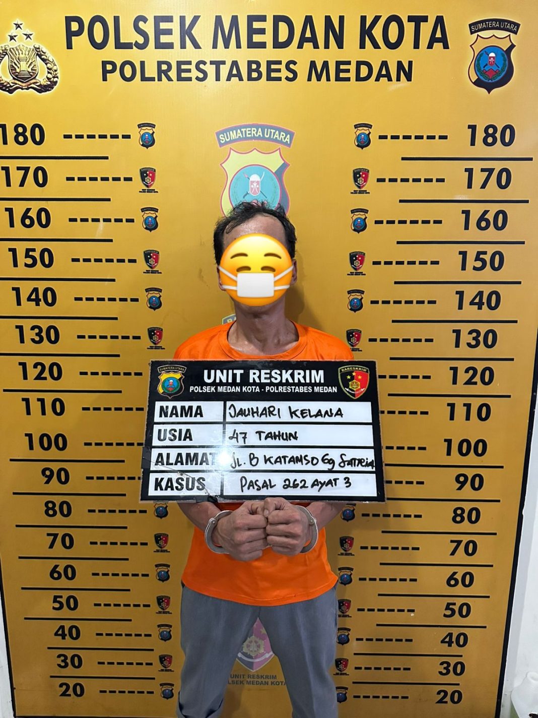 “Berbekal laporan korban, tepat Rabu 22 April 2026, sekira pukul 12.00 WIB, tim Tekab kita mendapat informasi dari masyarakat keberadaan terduga pelaku JK alias AB yang sedang berada dirumahnya Jalan Brigjen Katamso Gang Perwira, dan tim pun segera bergerak cepat mengamankannya.Saat dilakukan pengembangan untuk mencari terduga pelaku P dan D petugas kita tidak berhasil menemukannya keduanya, selanjutnya pelaku JK alias AB pun diboyong ke Mako Polsek Medan Kota, untuk pemeriksaan lebih lanjut.” terang Kapolsek Medan Kota.