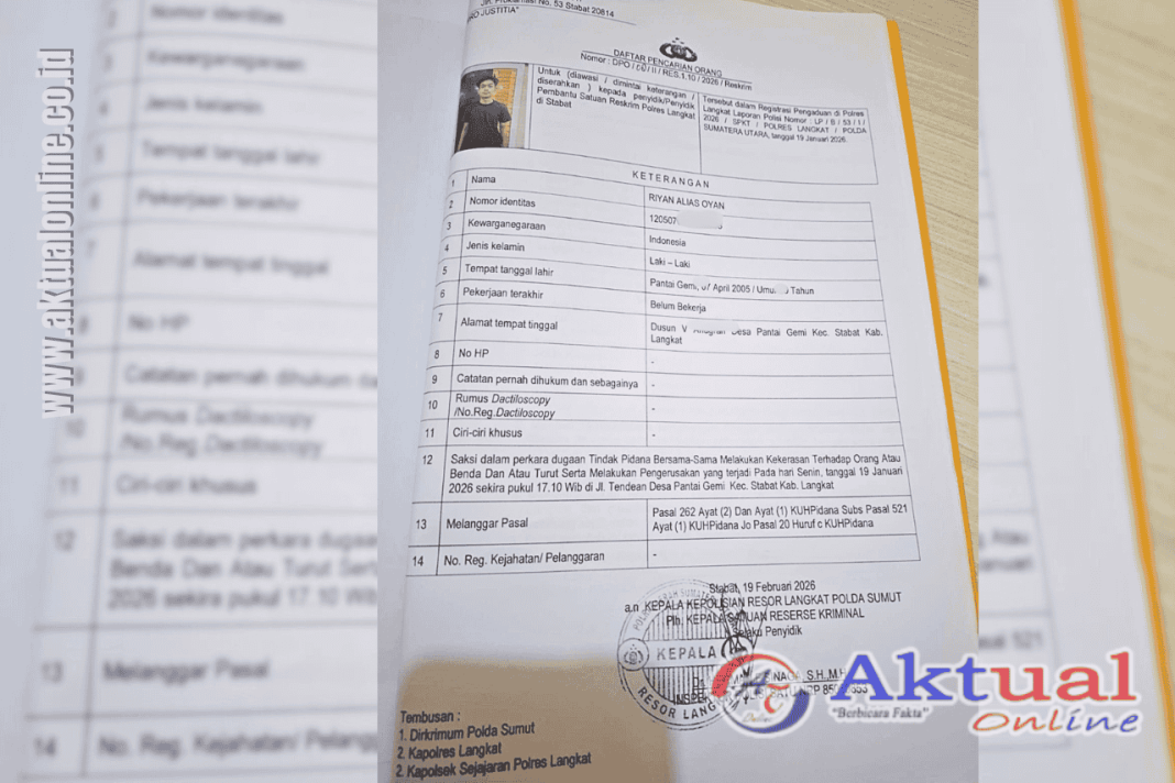 AKTUALONLINE.co.id – Langkat || Jauli Manalu selaku kuasa Hukum dari Dian Prah korban pengrusakan oleh sejumlah preman yang terjadi di UD. Aquaris pada 19 Januari 2026 silam mengimbau agar pelaku bersama Ryan alias Oyan segera menyerah karena sudah masuk Daftar Pencarian Orang (DPO).