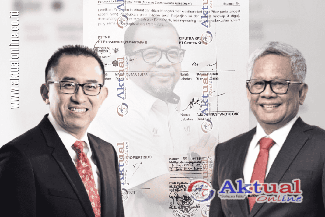 Direktur Utama PT. Ciputra KSPN Harun Hajadi, tanda tangan direktur PT. Ciputra KSPN di perjanjian proyek Citraland dan eks Dirut PTPN II (red.sekarang PTPN I Regional I) yang juga Dirut Agrinas M.Abdul Ghani (dari kiri ke kanan). (Foto: dok. Aktual Online)